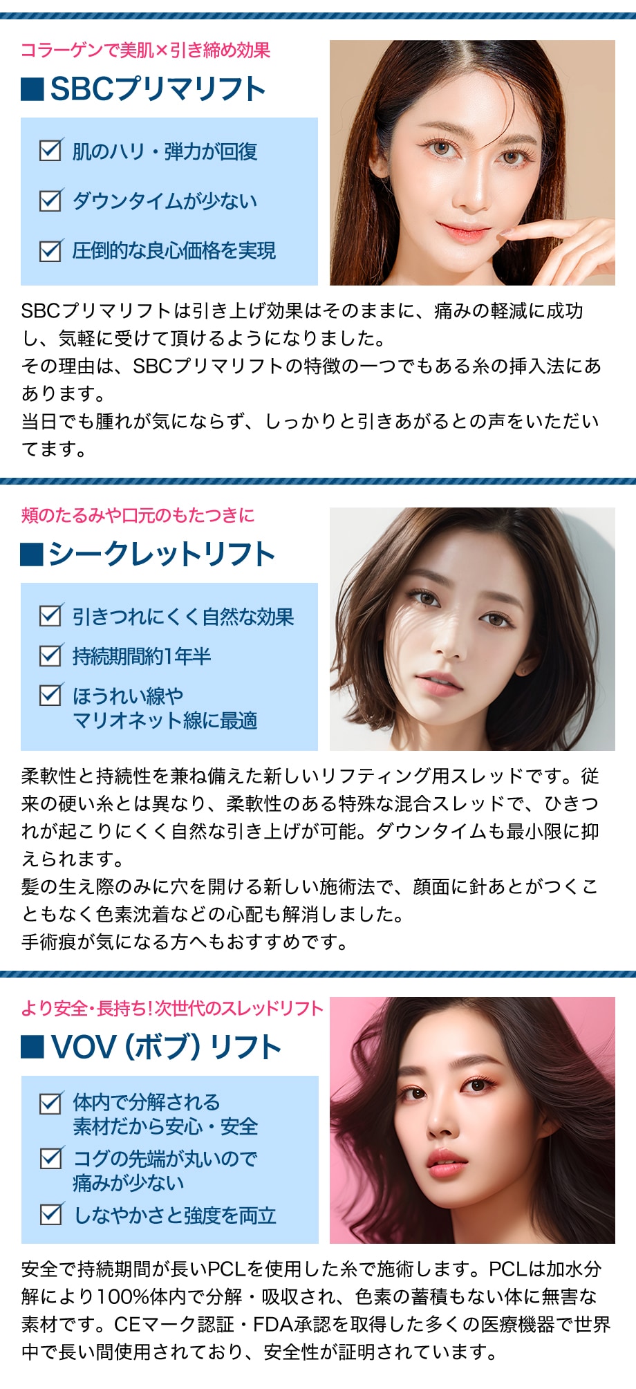 気になるフェイスラインのたるみやほうれい線、マリオネットラインなどお客様のお悩みに合わせて、最適な種類、本数をご提案します。