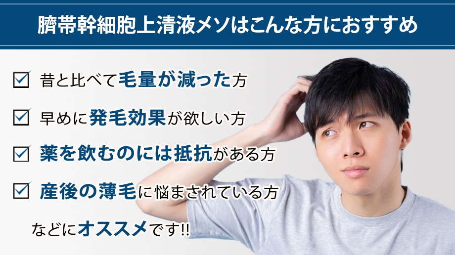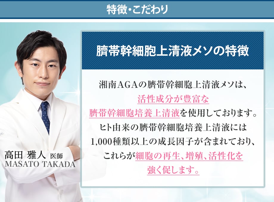 成長因子を含め細胞を再生、活性化させる成分が豊富に含まれている臍帯幹細胞上清液を頭皮に注入する事で、眠っている毛根を目覚めさせ、密度を増やす効果があります。