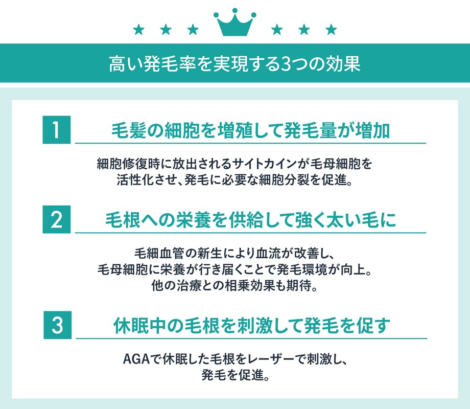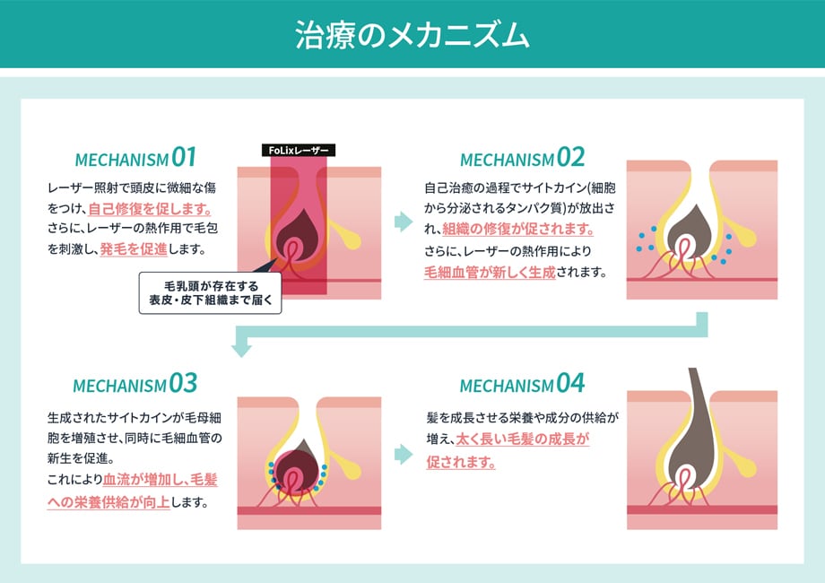 この刺激によって自己治癒の過程で成長因子が放出され、眠っていた「休止期」の毛根が「成長期」へと移行。