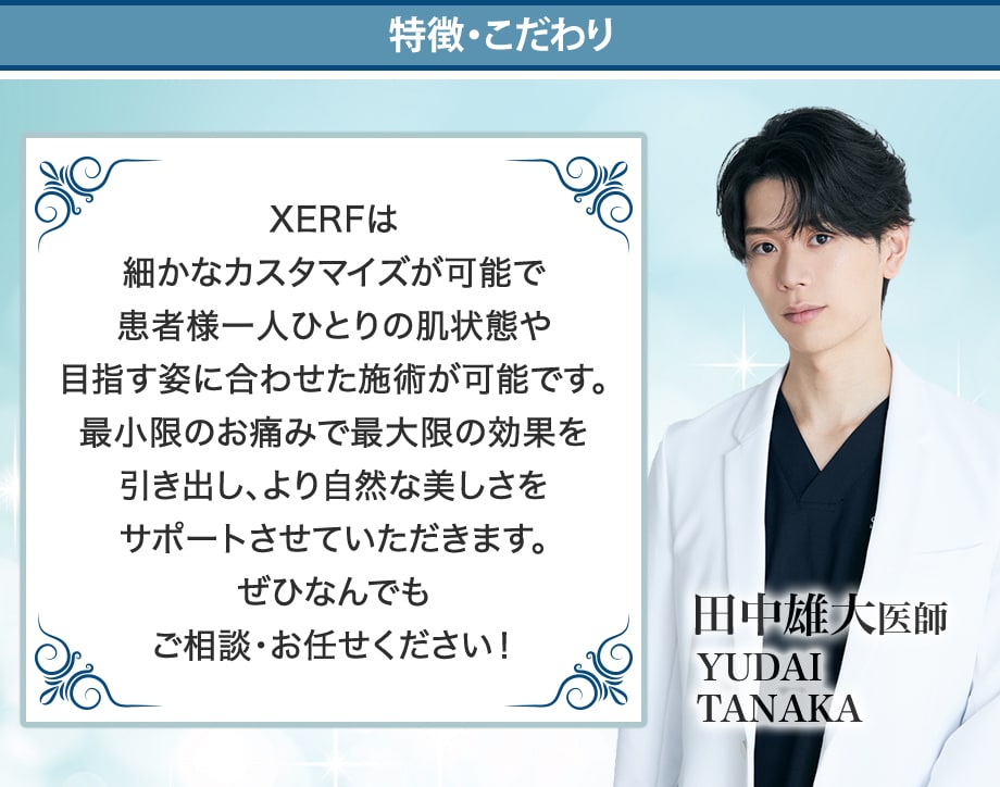 元々高周波たるみ治療器は周波数6.78MHzのみが主流でしたが、今回登場したXERFは世界初のデュアル周波数(6.78MHz +2MHz)の高周波たるみ治療器です。さらに、XERFでは今までの高周波機器にはない、3つのモードの使用が可能です。6.78MHz の役割としては皮膚に対しての熱発生効率が良い周波数のため、皮膚温度が上がることで熱伝導率がアップします。つまりそれと同時に2MHzを照射することで2MHzの伝導率があがり、6.78MHzのみのものよりもより深部にまで熱を発生させることができます。また、ボリュームダウンしたくない部分では、浅い部分を加熱するモードを使用することでコケずに照射が可能です。