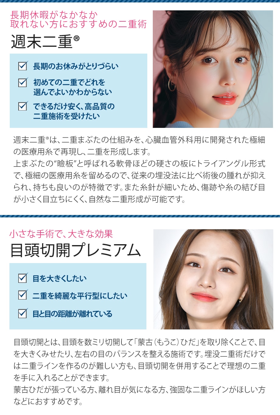 ダウンタイム・痛みを最小限に抑えつつ、デザインはお客様の希望になるべく沿えるように丁寧なカウンセリングで自分の目に合った似合わせ二重をご提案いたします!