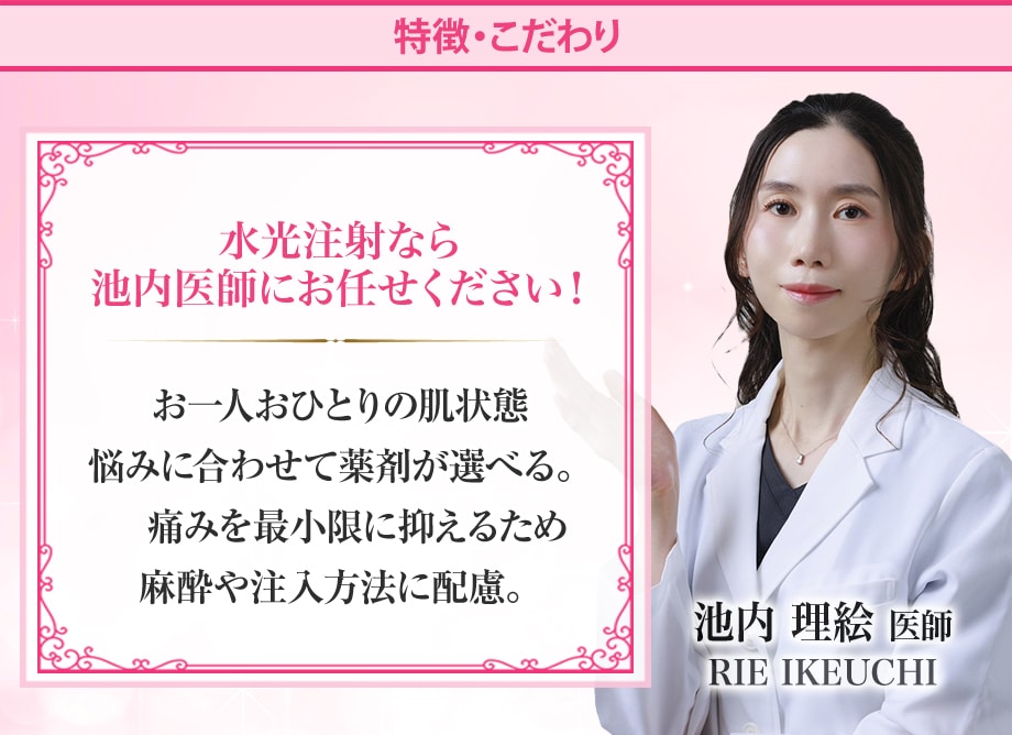 水光注射は、美肌成分を肌の浅い層に均一に注入することで、内側からうるおい・ハリ・透明感を引き出す治療です。