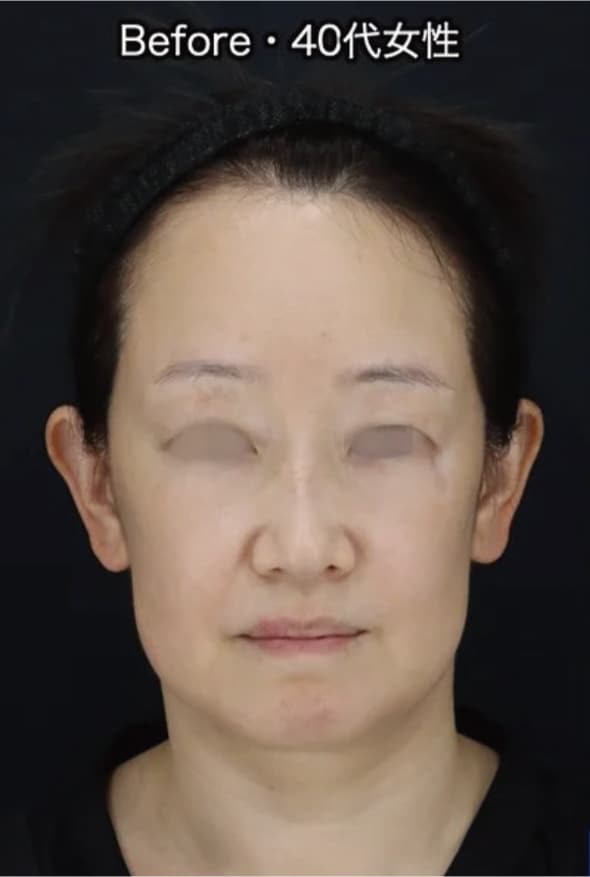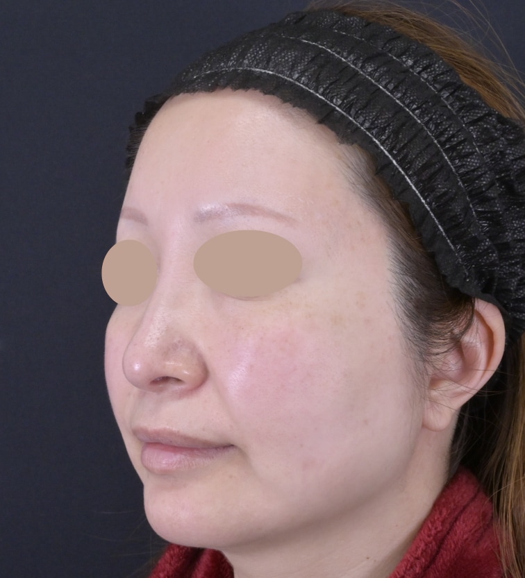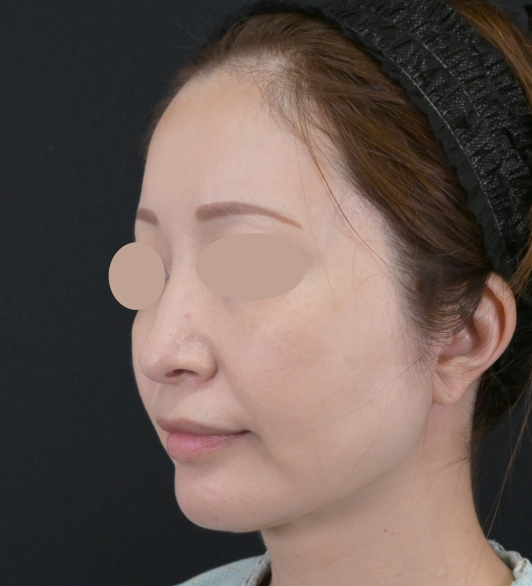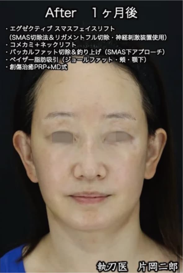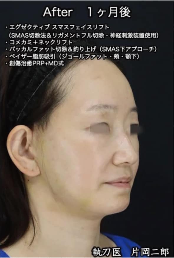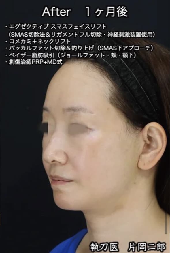 40代女性 エグゼクティブスマスフェイスリフト(SMAS切除+リガメント切除・神経刺激装置使用)+こめかみ&ネックリフト+ベイザー脂肪吸引(ジョールファット・頬・顎下)+バッカルファット切除&つり上げ固定+創傷治癒PRP+MD式+全身麻酔(麻酔専門医管理) 術後1ヶ月