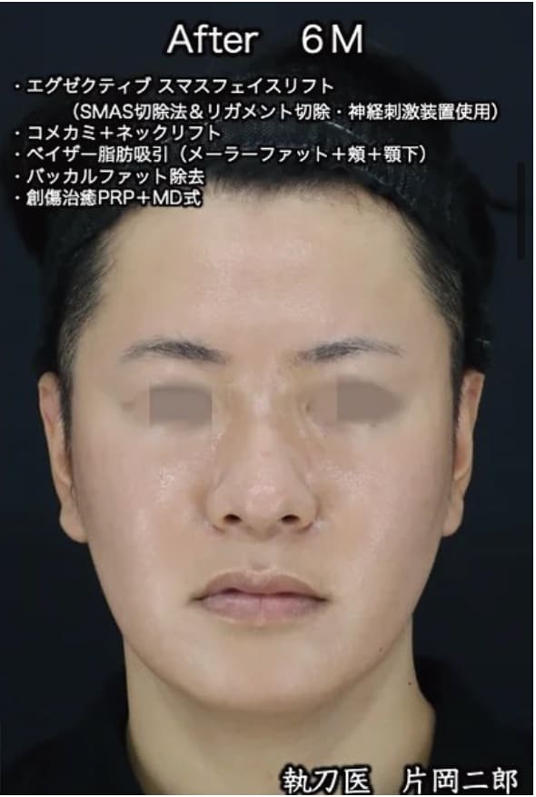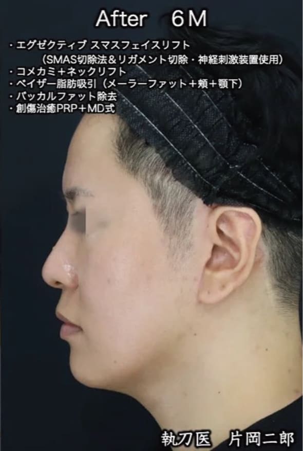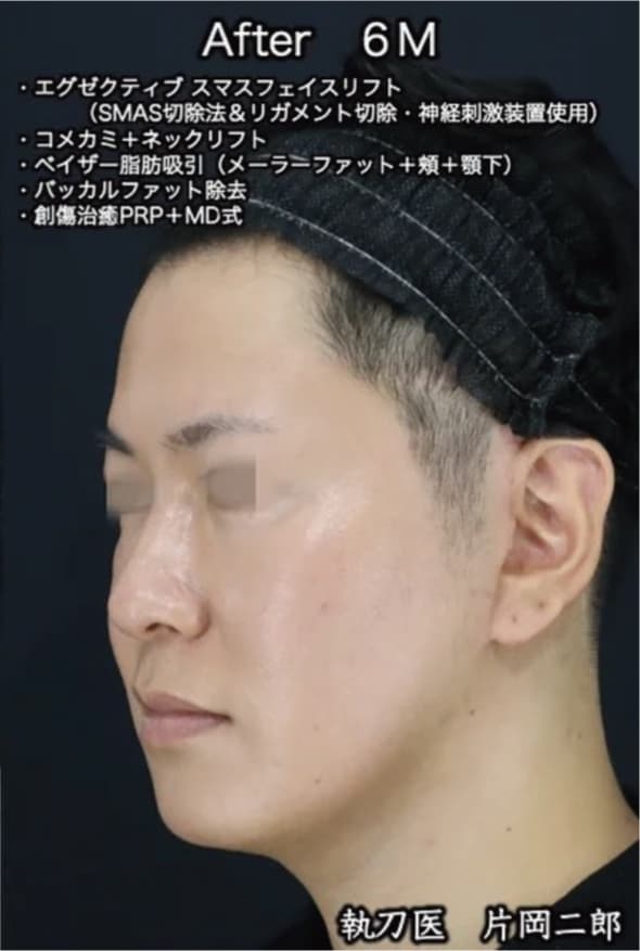 30代男性 エグゼクティブスマスフェイスリフト (スマス切除+リガメント切除・神経刺激装置使用)+コメカミリフト・ネックリフト+ベイザー脂肪吸引(ジョールファット+頬+顎下)+バッカルファット除去+創傷治癒PRP+MD式+全身麻酔(麻酔専門医) 術後6ヶ月
