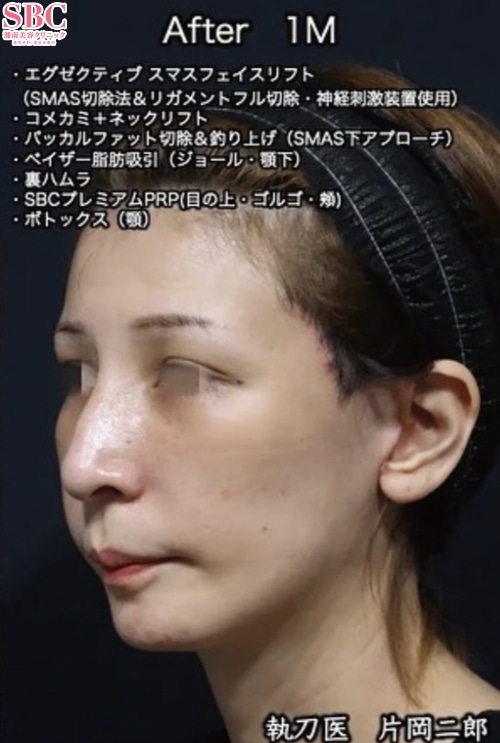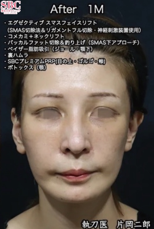40代女性 エグゼクティブスマスフェイスリフト (スマス切除+リガメント切除・神経刺激装置使用)+コメカミリフト+ネックリフト+ベイザー脂肪吸引(ジョールファット・頬・顎下)+バッカルファット除去+裏ハムラ法+SBCプレミアムPRP+ボトックス+全身麻酔(麻酔科専門医) 術後…