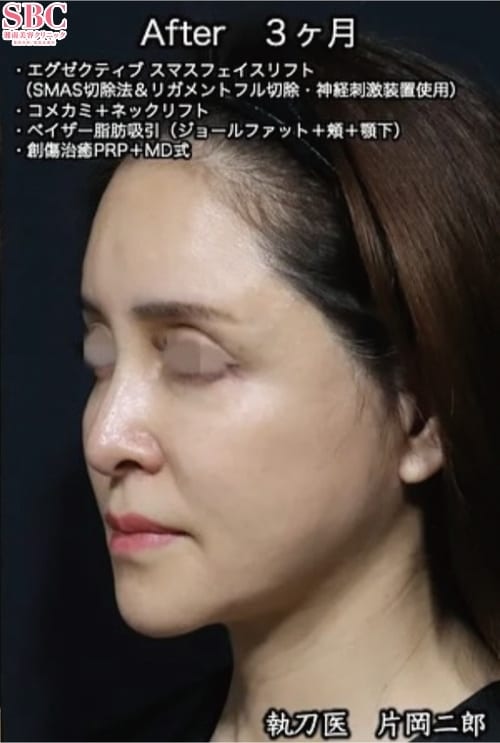50代女性 エグゼクティブスマスフェイスリフト(スマス下リガメントフル切除・神経刺激装置使用)+コメカミ&ネックリフト+ベイザー脂肪吸引(ジョールファット・頬・顎下)+創傷治癒PRP+MD式+全身麻酔(麻酔科専門医) 術後3ヶ月
