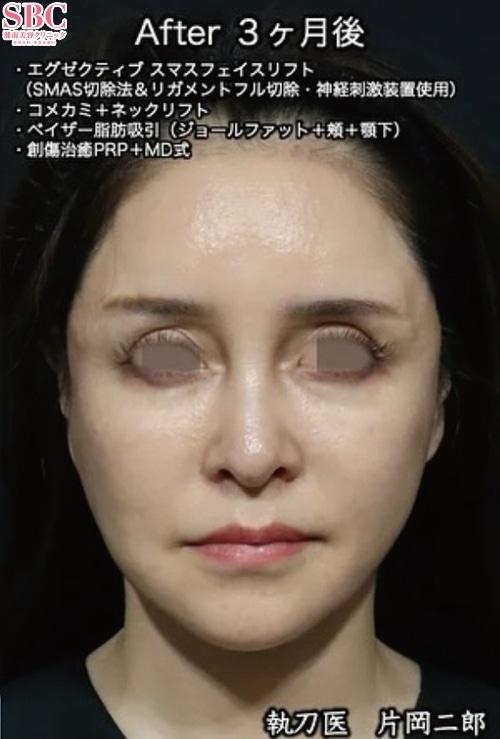 50代女性 エグゼクティブスマスフェイスリフト(スマス下リガメントフル切除・神経刺激装置使用)+コメカミ&ネックリフト+ベイザー脂肪吸引(ジョールファット・頬・顎下)+創傷治癒PRP+MD式+全身麻酔(麻酔科専門医) 術後3ヶ月