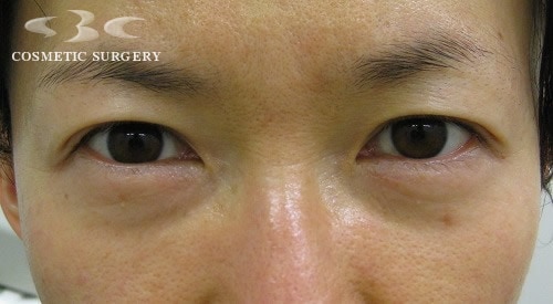 眼の下の膨らみと その下の凹みラインが 混在した方です。この方には まず 切らない眼の下のたるみ取りを行い 膨らみを減らした後、凹みラインに 御自身の 脂肪を注入するオートコラーゲン法を 行います。