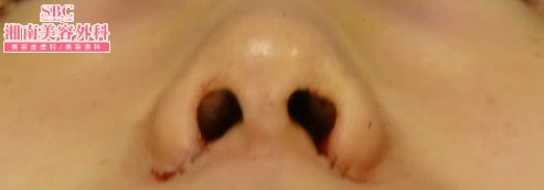 小鼻縮小 フラップ法です。通常の内側法と比べてあともどりがしにくい方法となります。今回はデザインは4?(実際小さくなるのは約3?)糸が目立たないように白糸のオプションをつけられています。腫れ、痛みは最小限です。