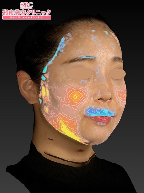 ベクトラ3Dを用いてボリュームの評価をすると脂肪減少効果がご覧の通り!赤系の等高線が入っている領域がボリュームが減っているところです。見事に顔の下半分のボリュームだけが減っています!顔の上半分や口周りの領域は赤くなっていないことから、モニター様がダイエットしたとか、そういう裏があるわけではないのも明白かと思います。このベクトラのデータを確認して改めて、この治療って良いなと確信した次第です。