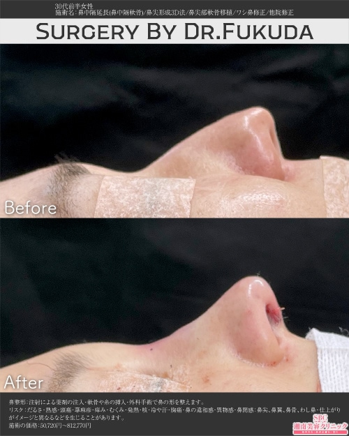 No.289190【鼻整形】鼻中隔延長(鼻中隔軟骨)+鼻尖形成3D法+鼻尖部軟骨移植+ワシ鼻修正+他院修正【施術直後】形成外科専門医による鼻整形!
