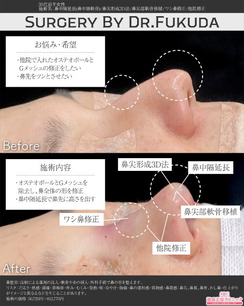 オステオポールとGメッシュを除去し、鼻尖形成3D法、鼻尖部軟骨移植、鼻中隔延長で鼻先の形を修正しています。