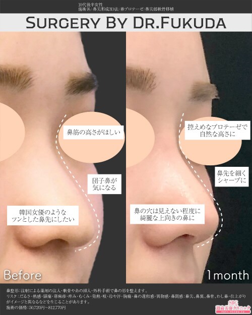 全体のバランスを考え、鼻筋はプロテーゼで高さを出し、鼻先は鼻尖形成3D法と鼻尖部軟骨移植で形と向きを調整しています。