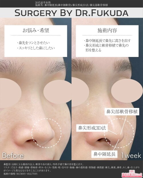 鼻中隔延長で鼻先に高さを出し、鼻尖形成3D法と鼻尖部軟骨移植で鼻先の形を整えています。