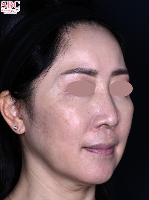 こちらのモデル様にはうるおいコラーゲンリフトというショッピングリフト・美容針を80本お受け頂きました。全体的にハリ感が出て、頬の高い所にツヤっとハイライトが入るようになりました。ご本人様が気にされていた口横のモタつきも改善されました。