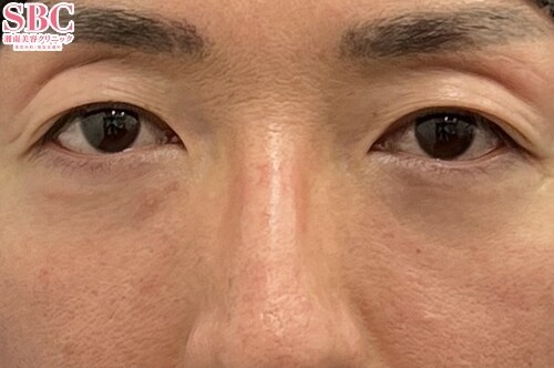 1ヶ月後の様子ですが、内出血や腫れは引いており目の下のふくらみは綺麗に改善しています。ふくらみがなくなるとこのように疲れた印象はなくなり、凛々しいお目元になったと思います。
