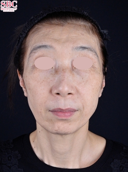 【解説】たるみやシワに関するお悩みが複数ある方であり、お顔全体の若返りをご希望されていたため、まずプロファイロでお肌の土台を再構成することにしました。プロファイロの施術終了後1か月では、中顔面や下顔面の小ジワが改善し、ボリュームロスも少し改善を認めました。さらにプロファイロは皮膚のターンオーバー促進効果もあり、お顔全体的に明るくなっており、くすみも改善してきているのがお分かり頂けるかと思います。