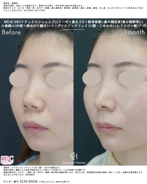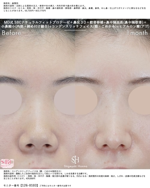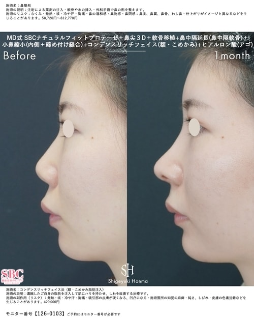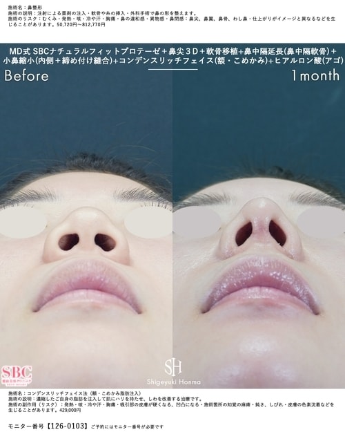 ■施術内容---------------------------------------------術前/術後1ヶ月・sbcナチュラルフィットプロテーゼ・鼻尖形成3D法・鼻尖部軟骨移植・鼻中隔延長(鼻中隔軟骨)・小鼻縮小(内側+締め付け縫合)・コンデンスリッチフェイス(額こめかみ)・ヒアルロン酸注入(アゴ)■こだわり---------------------------------------------鼻整形×額こめかみの脂肪注入鼻整形は、バランスが大事です。鼻の形を整えてあげるのはもちろん、顔全体とのバランスも大事になってきます。鼻の高さが出ると、顔は立体的になりますが、額が平面だと全体のバランスが悪くなります。そのため、鼻整形される方には、一緒におでこを丸くするご提案をすることが多いです。■ご不安な方へ---------------------------------------ベクトラ3Dシミュレーションの導入院です。術前の自分の姿を撮影し、鼻整形後の姿をシミュレーションしながらカウンセリングを受けることが可能です。ぜひ、一度カウンセリングにお越しください!■SNS--------------------------------------------------instaの方ではより詳しく&沢山の症例写真を載せています!是非チェックしてみて下さい♪@sbc_honma.shigeyuki