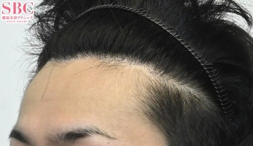 肉眼にて、M字は平均のヘアラインより1.5�p広く、ヘアラインの不明瞭化も認められます。