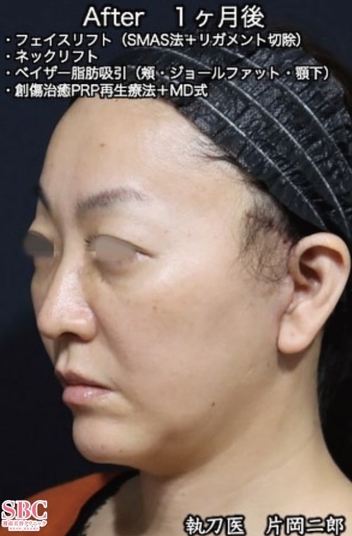 50代女性のお客様です。フェイスラインのたるみ・重さを根本的に改善したいとのご要望でした。糸リフトでは太刀打ち出来ませんので、以下の手術を行っております。・フェイスリフト(SMAS法・リガメント切除)・ネックリフト・ベイザー脂肪吸引(頬・ジョール・顎下)・創傷治癒PRP再生療法+MD式術後1ヶ月目の比較写真です。術後1ヶ月目は脂肪吸引エリアの拘縮期となるので、まだまだ硬さが気になる時期ですが、すでにフェイスラインはスッキリしてますね。拘縮や浮腫が改善する3~6ヶ月後が完成となりますが、傷跡など細かい部分は1年程度でより目立たなくなっていきます。今回のお客様はすでに傷跡も目立たないですね。耳垂変形も無く、良い経過だと思います。こちらのお客様は今後眉下切開、眼瞼下垂、下眼瞼治療を行う予定です。 執刀医 片岡二郎●医師・医学博士/美容外科専門医(JSAS)●医師歴27年(脳神経外科歴10年・美容外科歴17年)●SBCグループ技術統括医長●湘南美容クリニック新宿本院勤務●22年・23年度 若返りのエキスパートドクター認定医●切開フェイスリフト 5期連続執刀件数 全国1位(21~23年上半期SBC内)●22年 眼瞼下垂 執刀件数 全国2位(SBC内)