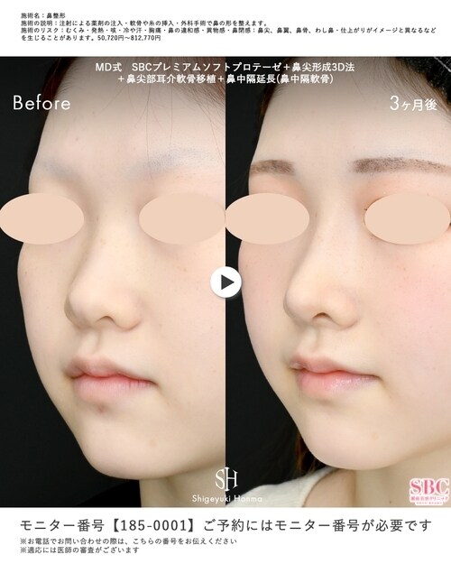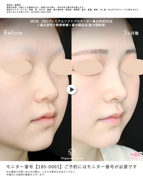 ■施術内容---------------------------------------------術前/術後3ヶ月・SBCプレミアムソフトプロテーゼ・鼻尖形成3D法・鼻尖部耳介軟骨移植・鼻中隔延長(鼻中隔軟骨))■こだわり---------------------------------------------鼻整形は、バランスが大事です。鼻の形を整えてあげるのはもちろん、顔全体とのバランスも大事になってきます。カウンセリングでシミュレーションを用いながら必要な施術を丁寧にお話しさせていただきます。■お知らせ---------------------------------------------ベクトラ3Dシミュレーションの導入院です。術前の自分の姿を撮影し、鼻整形後の姿をシミュレーションしながらカウンセリングを受けることが可能です。ぜひ、一度カウンセリングにお越しください!■SNS--------------------------------------------------Instagramでは、より詳しく&沢山の症例写真を載せています!是非チェックしてみて下さい♪@sbc_honma.shigeyuki