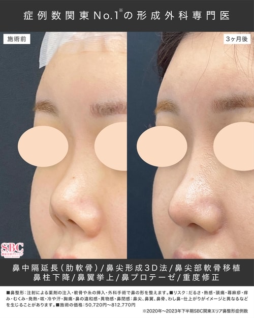 No.334966【鼻整形】外傷性の拘縮を肋軟骨による鼻中隔延長で修正【鼻中隔延長(肋軟骨)+重度修正+鼻尖形成3D法+鼻尖部軟骨移植+鼻柱下降+鼻翼挙上+鼻プロテーゼ】形成外科専門医による鼻整形【術後3ヶ月】