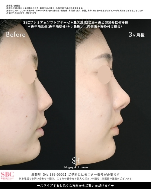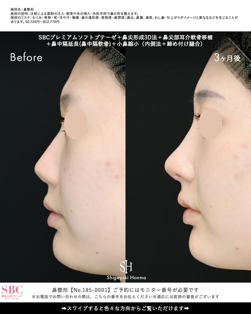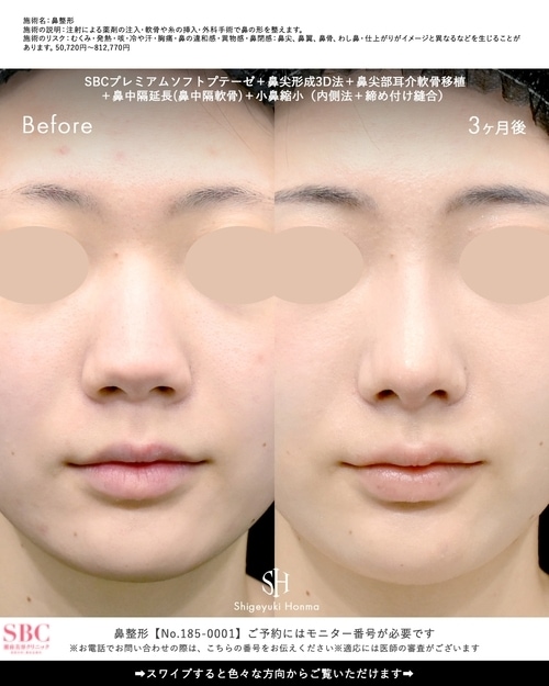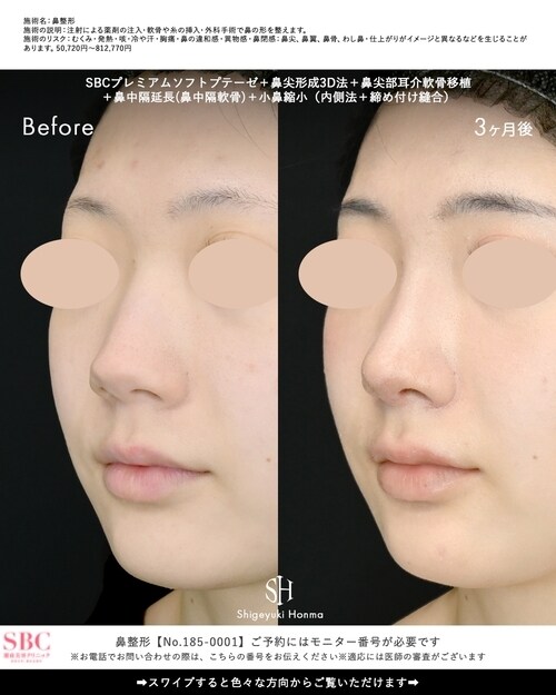 ■施術内容---------------------------------------------術前/術後3ヶ月・SBCプレミアムソフトプロテーゼ・鼻尖形成3D法・鼻尖部耳介軟骨移植・鼻中隔延長(鼻中隔軟骨)・小鼻縮小(内側法+締め付け縫合)■こだわり---------------------------------------------鼻整形は、バランスが大事です。鼻の形を整えてあげるのはもちろん、顔全体とのバランスも大事になってきます。カウンセリングでシミュレーションを用いながら必要な施術を丁寧にお話しさせていただきます。■お知らせ---------------------------------------------ベクトラ3Dシミュレーションの導入院です。術前の自分の姿を撮影し、鼻整形後の姿をシミュレーションしながらカウンセリングを受けることが可能です。ぜひ、一度カウンセリングにお越しください!■SNS--------------------------------------------------instaの方ではより詳しく&沢山の症例写真を載せています!是非チェックしてみて下さい♪@sbc_honma.shigeyuki