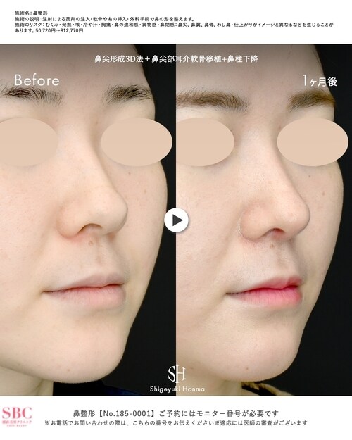 ■施術内容---------------------------------------------・鼻尖形成3D法・鼻尖部耳介軟骨移植・鼻柱下降術■こだわり---------------------------------------------鼻整形は、バランスが大事です。鼻の形を整えてあげるのはもちろん、顔全体とのバランスも大事になってきます。カウンセリングでシミュレーションを用いながら必要な施術を丁寧にお話しさせていただきます。■お知らせ---------------------------------------------ベクトラ3Dシミュレーションの導入院です。術前の自分の姿を撮影し、鼻整形後の姿をシミュレーションしながらカウンセリングを受けることが可能です。ぜひ、一度カウンセリングにお越しください!■SNS--------------------------------------------------instaの方ではより詳しく&沢山の症例写真を載せています!是非チェックしてみて下さい♪@sbc_honma.shigeyuki