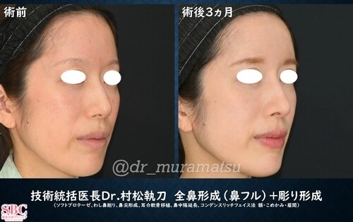 本日ご紹介する症例の患者様は鼻を全体的に整えつつ、横顔を美しくしたい、とのご希望でした。現状の横顔は・ややノッペリとして平たい印象・わし鼻と鼻先の大きさがあり、ゴツゴツした印象・軽く口元が突出した印象と言えるかと思います。よって手術計画としては下記のようになりました。・鼻先に立体感を出しつつ、鼻唇角が奥まった状態を改善させる・それに見合うよう、鼻筋を通す この際わし鼻の出っ張り(ハンプ)が邪魔なので少し削る・通った鼻筋に見合うよう、彫りを作る この際に上顔面全体にボリュームを出し、平たい印象を改善させる・もちろん自然に見える範囲(大前提)でこれらを実現すべく、・全鼻形成(鼻フル:プロテーゼ、鼻尖形成、鼻中隔延長、耳介軟骨移植)・彫り形成(脂肪注入:コンデンスリッチフェイス法 額、コメカミ、眉間)を行うこととしました。術前→術後3ヵ月です。おおよそ術前の計画通りの結果となりました。患者様にも大変ご満足いただけました。鼻のフルコースに脂肪注入も、となると大掛かりな気がすることは否めないと思います。また、美容整形はやればやるほど不自然(整形顔)になってしまうとお思いの方も多いとは思います。しかし、これらのご提案は患者様のご要望を「自然に見える範囲で」実現するためにはどれも必要不可欠な手術となります。例えば今回の内容から脂肪注入(コンデンスリッチフェイス法)を抜くと、高くなった鼻筋に元の彫り感が見合わず、いわゆるアバターのような仕上がりになってしまいます。私に関してはカウンセリングにおいて余計なアップセルをすることはまずありません。盛り盛りな内容のご提案になってしまうこともありますが、それはあくまで自然に仕上げるために必須となる内容であることがほとんどです。ご参考になりましたら幸いです。