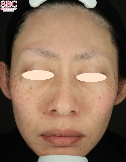 老人性色素斑と雀卵斑(そばかす)というシミが混在している方でした。