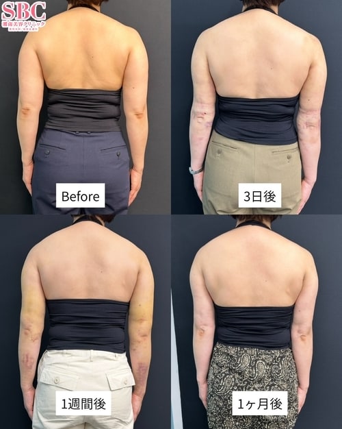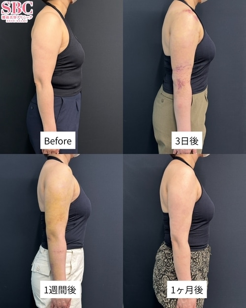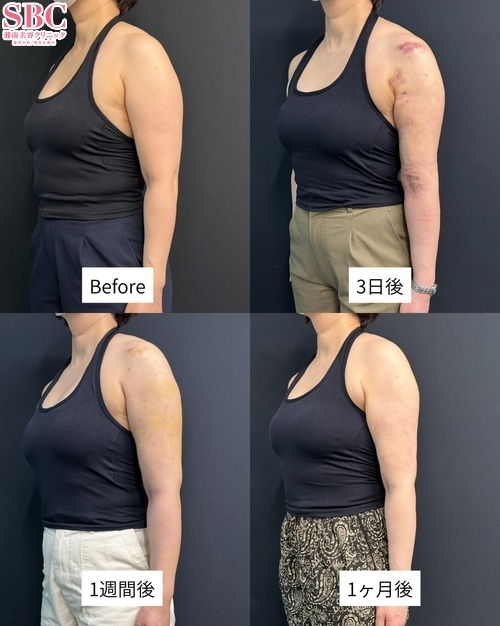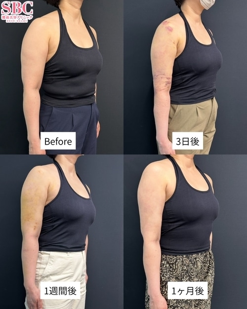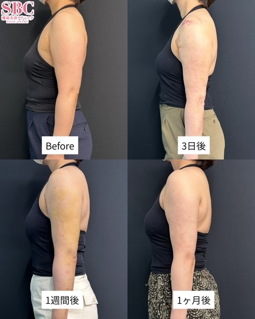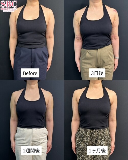 この方は、二の腕のボリュームやたるみを改善したいというご希望で来院されました。施術内容は「二の腕全周・肩の脂肪吸引」です。余分な脂肪を丁寧に除去することで、肩から肘にかけてすっきりとしたラインをデザインしました。脂肪を取り除く際には、皮膚の引き締めにも配慮し、自然で美しい仕上がりを目指しています。二の腕は「太って見える」「好きな服が着られない」などのお悩みが多い部位のひとつです。脂肪吸引によって余分な脂肪を取り除き、引き締めを同時に行うことで、なめらかでシャープな腕のラインを実現できます。これまで多くの方の二の腕治療を担当してきた経験から、それぞれの体型やご希望に合わせてデザインし、バランスの取れた仕上がりを目指しています。「二の腕をほっそりさせたい」「後ろ姿をすっきり見せたい」など、どんなお悩みでもお気軽にご相談ください。カウンセリングにて最適な方法をご提案させていただきます。