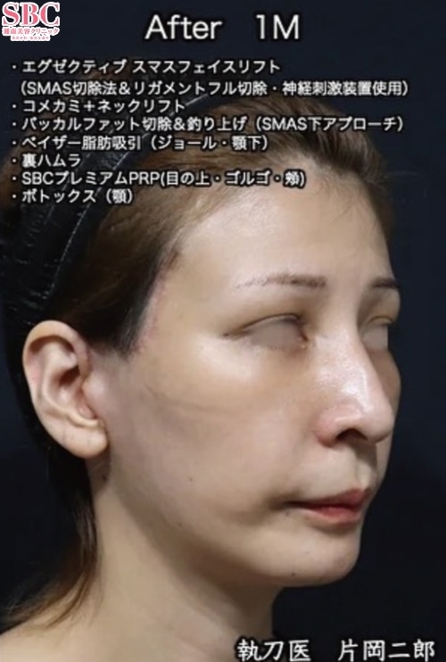 40代女性のモニター様です。根本的な若返り治療をご希望されました。以前に行った糸リフトでは満足いく結果ではなかったとの事です。今回以下の治療を担当させていただきました。・エグゼクティブスマスフェイスリフト(スマス切除+リガメントフル切除・神経刺激装置使用)・コメカミリフト(モミアゲ温存デザイン)・ネックリフト・ベイザー脂肪吸引(ジョール・頬・顎下)・バッカルファット切除&吊り上げ固定(SMAS下アプローチ)・裏ハムラ・SBCプレミアムPRP(目の上・ゴルゴライン・頬)・ボトックス(顎)・全身麻酔(麻酔専門医)術後1ヶ月後の比較写真です。しっかりとした効果に大変お喜びいただいております。拘縮期真っ只中ですが、見た目にはほとんどわからないですね。切開ラインもすでに目立ちません。フェイスラインの劇的変化に目が行きますが、目の上の凹み・目の下のクマもしっかりと改善しております。----------------------------------------------------執刀医 片岡二郎●医師・医学博士/美容外科専門医(JSAS)●湘南美容クリニック新宿本院勤務●医師歴25年以上(脳神経外科歴10年・美容外科歴20年)●SBCグループ技術統括医長●2021年-2024年 4年連続 若返りのエキスパートドクター認定医●切開フェイスリフト 執刀件数 4年連続全国1位(21年-24年 SBC内)ご予約の際は「片岡医師指名」とお伝えください。ご予約はこちらから新宿本院0120-5489-40もしくはMy SBCからご予約ください。instagram@sbc_kataokaで検索