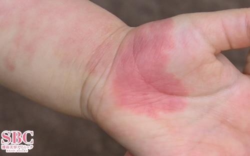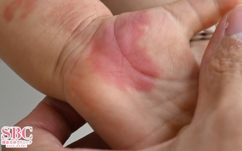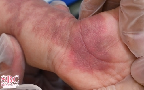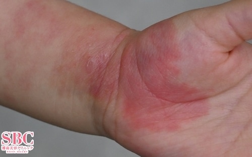 3回治療後3ヶ月の時点で手のひらと腕の先端近くの赤さが減っていることが分かります。