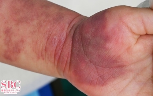写真では写っていませんが、腕の内側に肘の上まで赤あざを認めたため、
