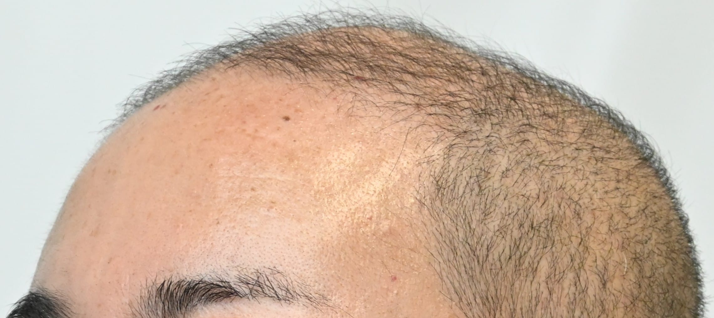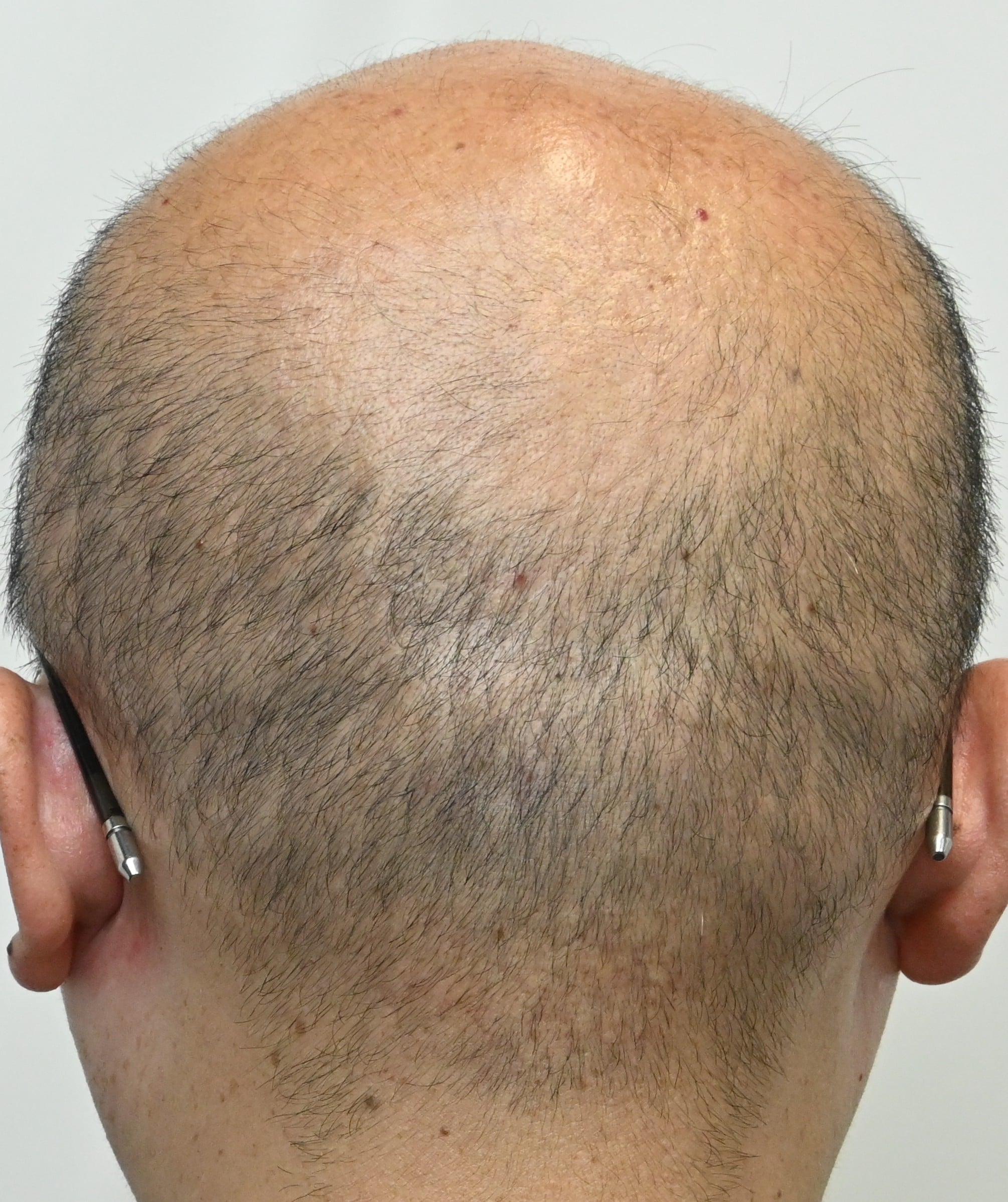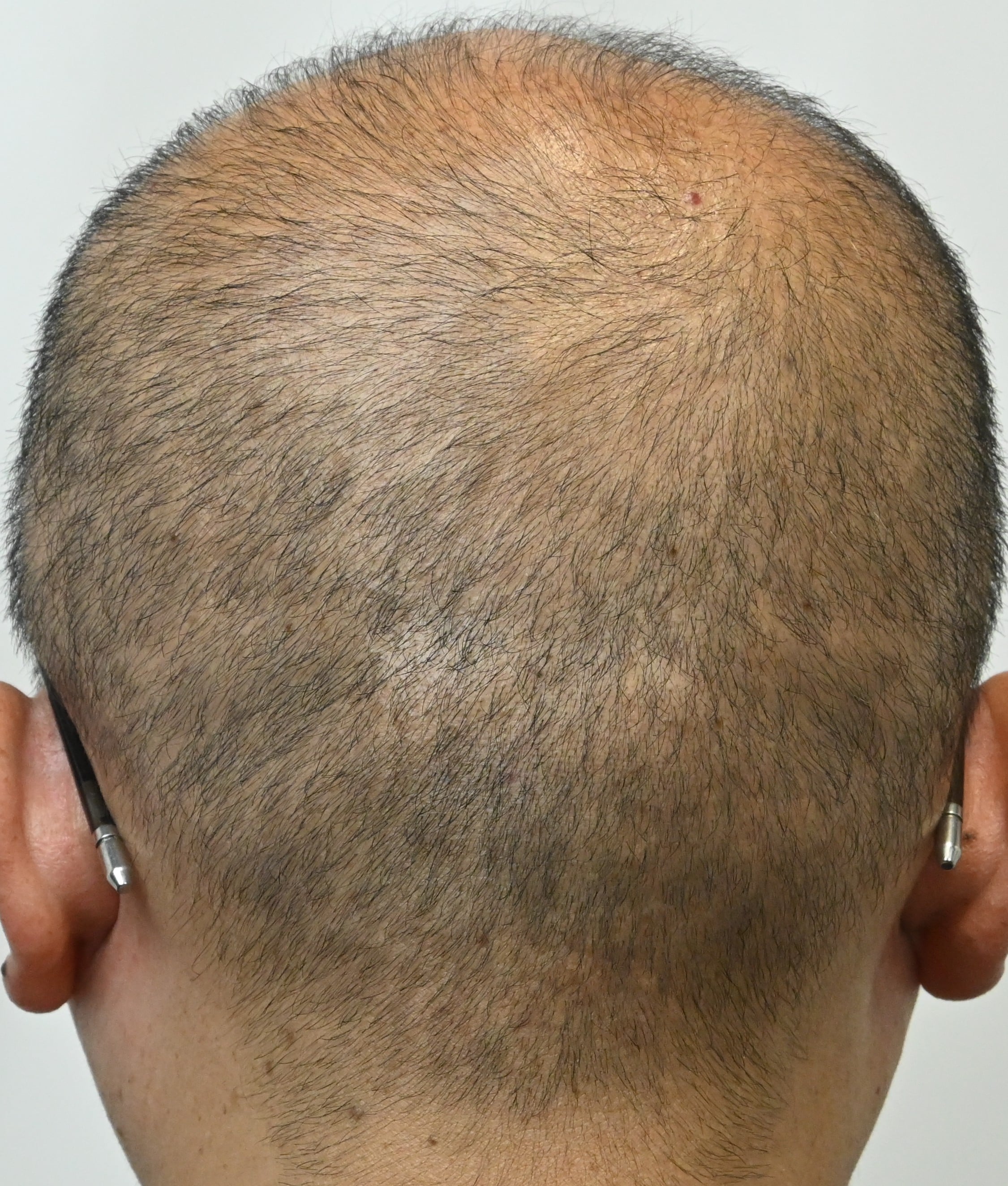 生え際から頭頂部にかけて高度にAGAが進行しているため、ふさふさまで戻ることは難しいことをお伝えし、そのうえで出来る限り改善したいとのことでしたので最大限治療を組み合わせ受けていただきました。