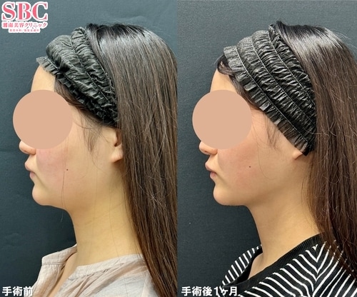 お客様はしっかりと変化を出して小顔になりたいというご希望で、ベイザー脂肪吸引を選択されました。手術前はフェイスライン全体にもたつきがみられましたが、手術後1ヶ月ですでにフェイスラインがかなりシャープに変化しています。完成は半年後なので、ここからさらに引き締まっていきます。