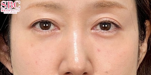 疲れて見える原因だった目の下のふくらみを取り除き、くぼみには脂肪注入で滑らかなハリをプラスしました。これにより、光が綺麗に反射する「レフ板効果」が生まれ、目元全体がワントーン明るくなりました。