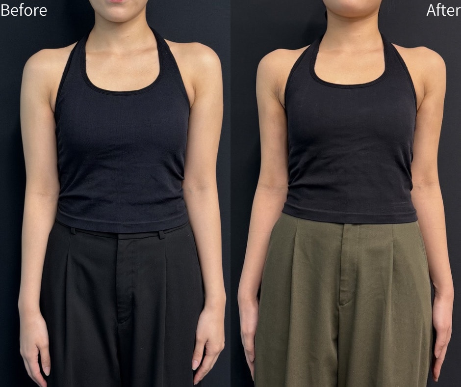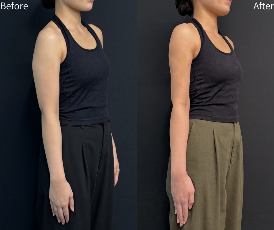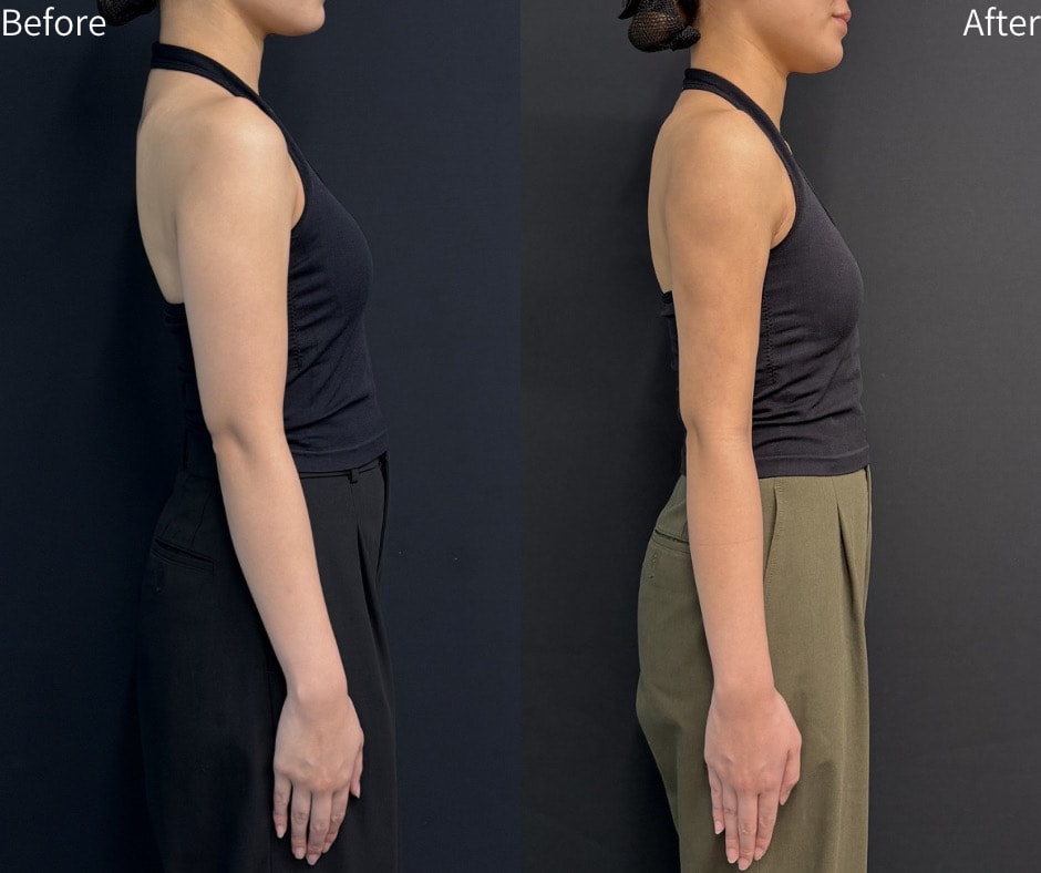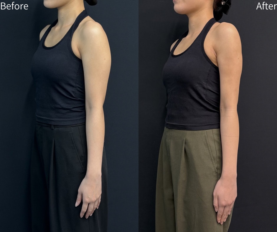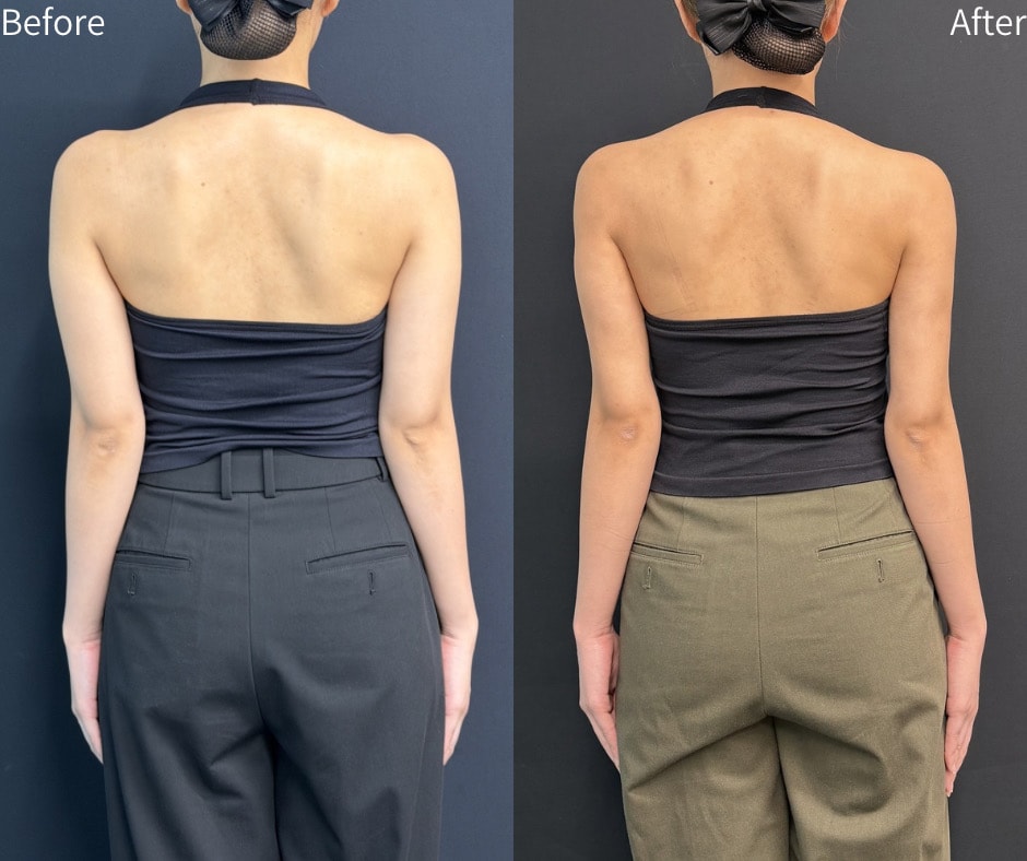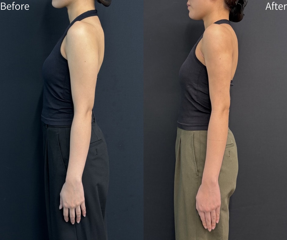 施術内容は「二の腕・肩・上背部の脂肪吸引」です。余分な脂肪を丁寧に除去することで、肩から肘にかけてすっきりとしたラインをデザインしました。脂肪を取り除く際には、皮膚の引き締めにも配慮し、自然で美しい仕上がりを目指しています。