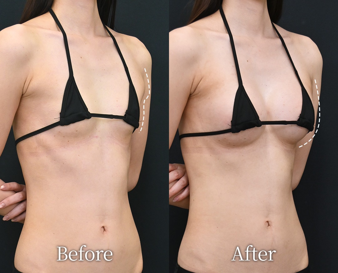 副乳の脂肪吸引とエンブレイスの同時手術で脇の膨らみが無くなり、バストラインが丸く整いました。