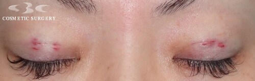 当院カウンセラーです。ラインを拡げて平行型の二重にし、更に以前の埋没法二重術による糸のポツポツを改善したいとのご希望でした。写真では分かりにくいのですが、糸による結び目がポツポツと見えてしまっています。