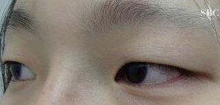 術前のお写真です。年齢にすればややまぶたのたるみがあり重たい印象になっています。アイプチ使用が影響している可能性があります。腫れづらいばれづらい二重術の3点留めを行いました。
