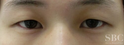 術前です。 一重瞼でした。 自然な奥二重に近い末広型の二重になりたいとのことで、手術を希望されました。 ダウンタイムが最も少なく、術直後から瞼に全く傷がつかないクイックコスメティーク法を選択されました。