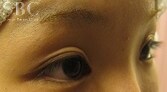 術前。20歳前半女性。ごく軽度の眼瞼下垂を認め、アイプチによる瞼のむくみが強い方で平行の二重を希望されました。本来なら、埋没法の適応からは大きく外れてしまいます。一つは眼瞼下垂が軽度でもあると埋没法により開眼ができにくくなるリスクがあり、さらに幅広希望なのでなおさら起こりえます。また、蒙古襞の発達が強くそれだけでも平行二重が厳しい状態です。今回はどうしても埋没法でできる限り平行二重にしたいということでリスクを十分お話しした上で施術させていただきました。
