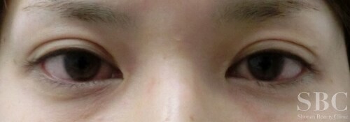 術前です。 アイプチをはずした直後は二重のクセがつきますが、時間がたつと一重に戻ってしまうので、同じラインで固定して欲しいとのことで、手術を希望されました。 この写真はアイプチをはずした直後なので、そのラインでクセがついています。 ダウンタイムが最も少なく、術直後から瞼に全く傷がつかないクイックコスメティーク法を選択されました。