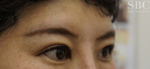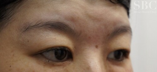 施術前 かなりの皮膚のたるみ、目の開き辛さ、それに伴う額のしわ、左右差、のある方です。