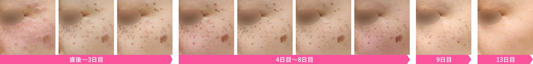 | 当日 | レーザーによる直後の炎症を抑えるために、お渡しするお薬(軟膏)を塗布してください。1日2回洗顔後に2週間塗布してください。 |